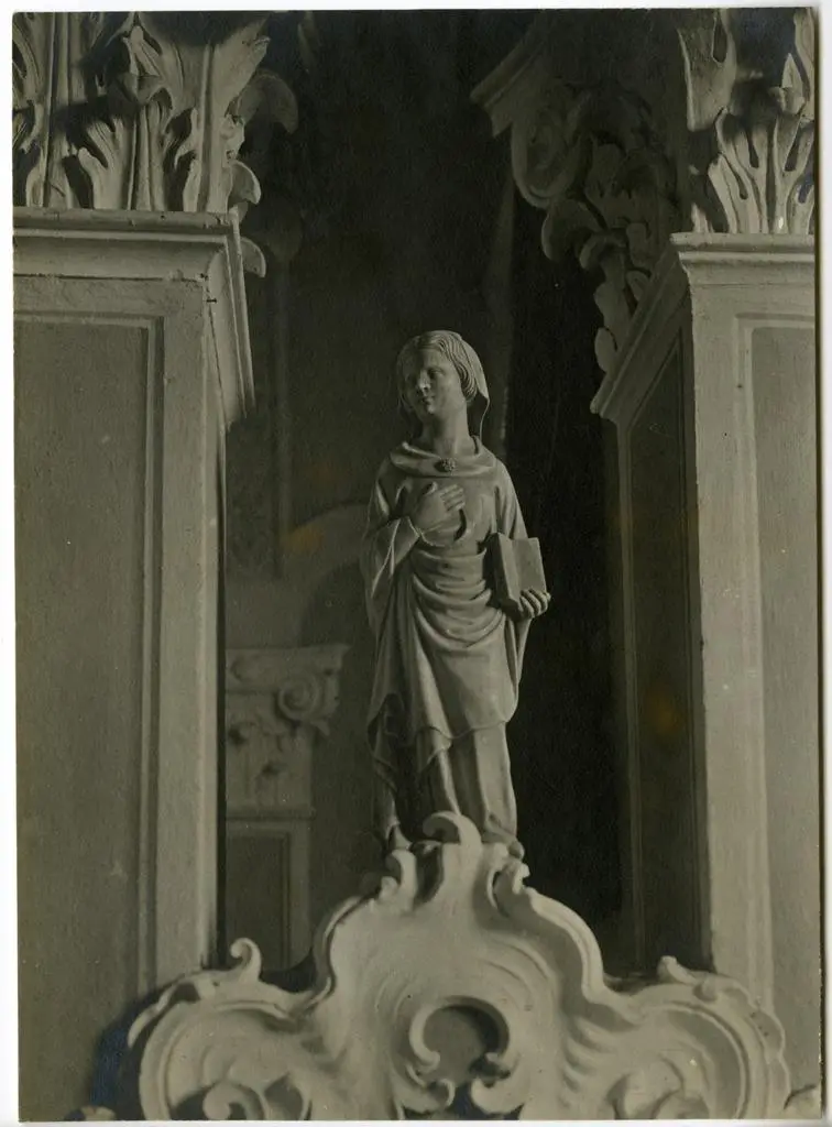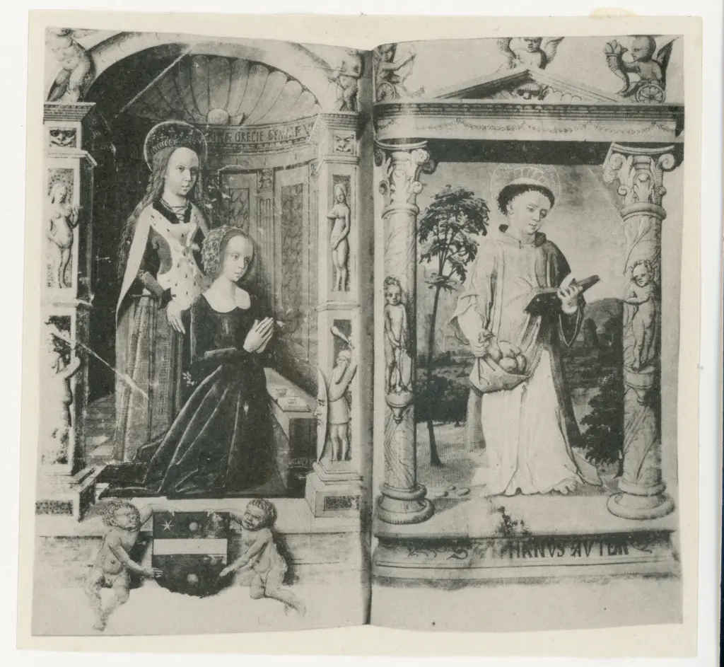 Anonimo sec. XV , Ritratto di gentildonna in preghiera, Maria Vergine, Santo Stefano, Finte architetture e stemma Anonimo sec. XV