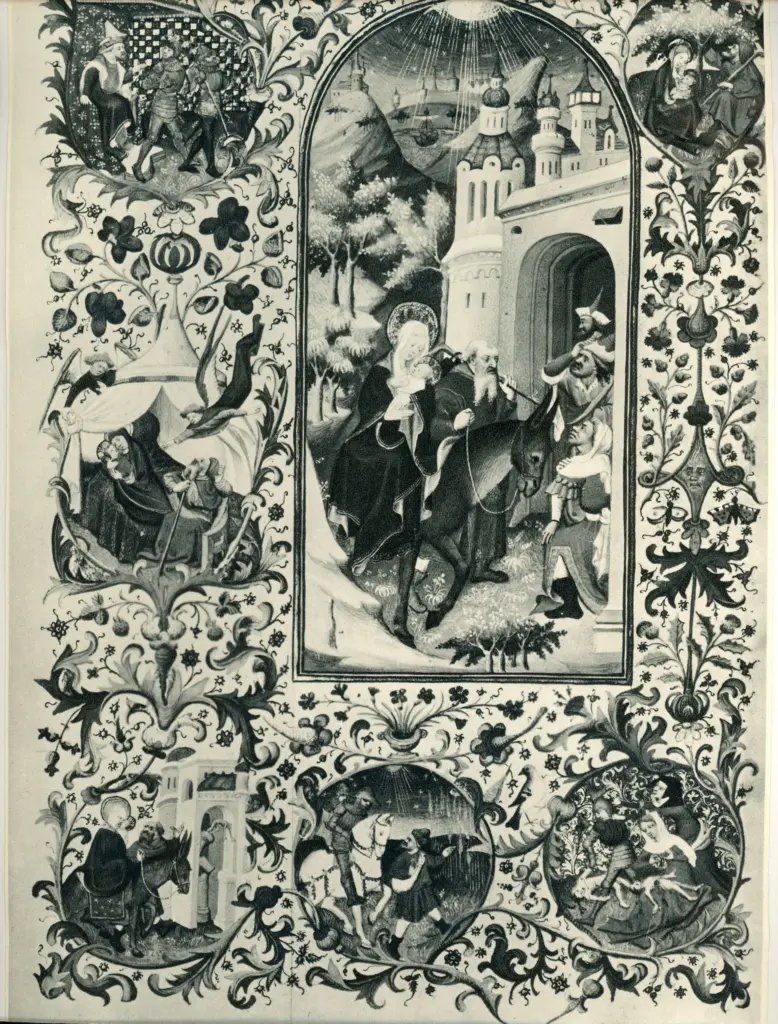 ![Anonimo sec. XV , Episodi del Nuovo Testamento, Fuga in Egitto, Cornice con motivi decorativi fitomorfi]()
