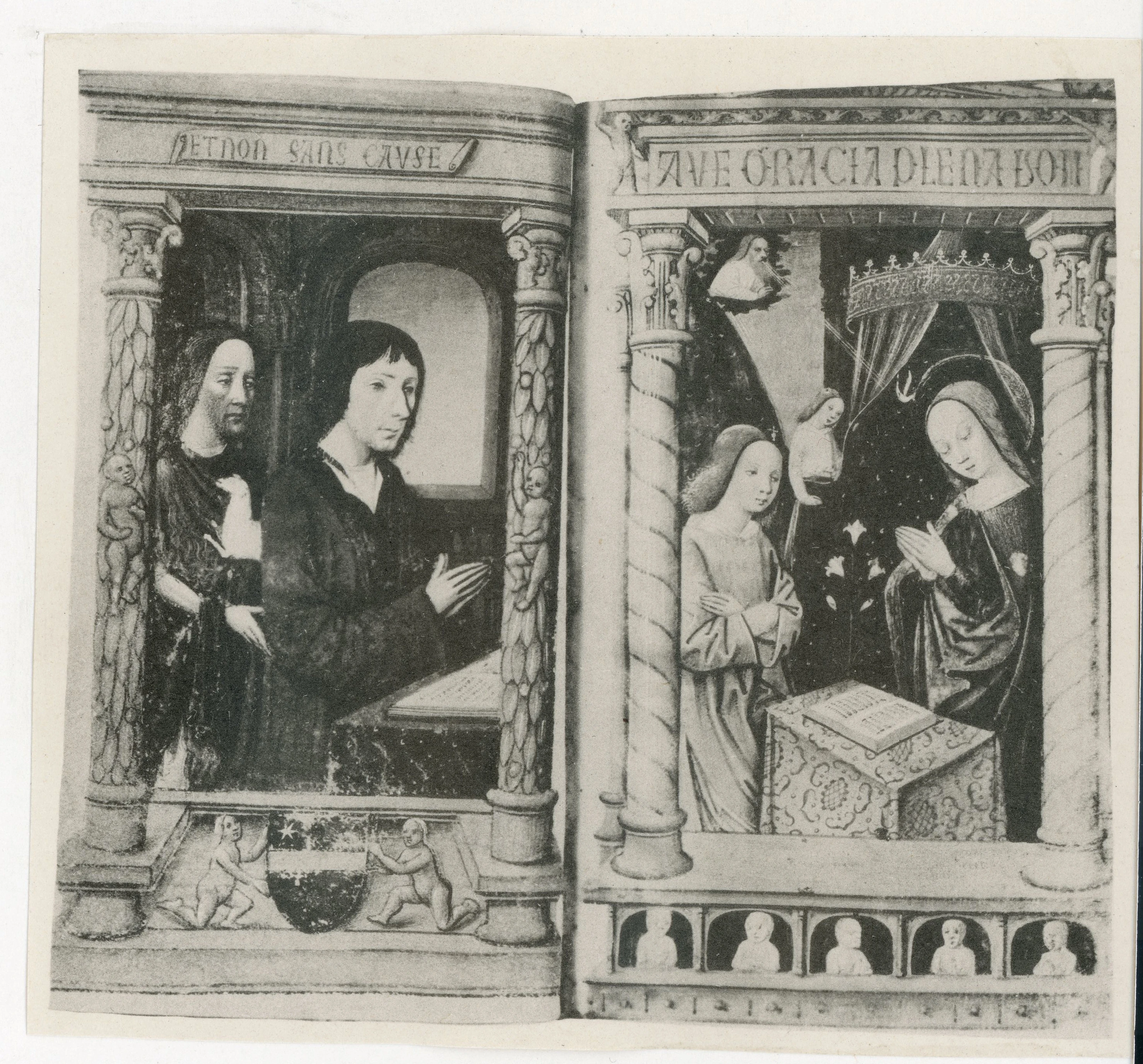 ![Anonimo sec. XV , Ritratto di gentildonna in preghiera, Maria Vergine, Santo Stefano, Finte architetture e stemma]()