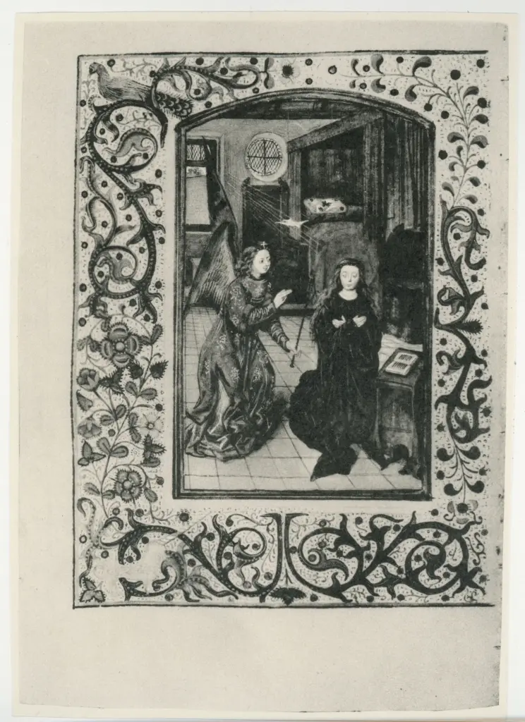 ![Anonimo sec. XV , Annunciazione, Interno di camera da letto, Cornice con motivi decorativi fitomorfi e animali, Pavone]()