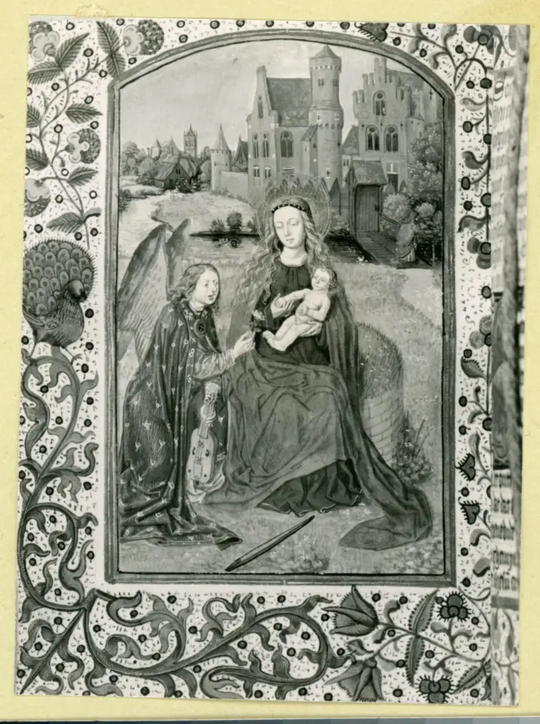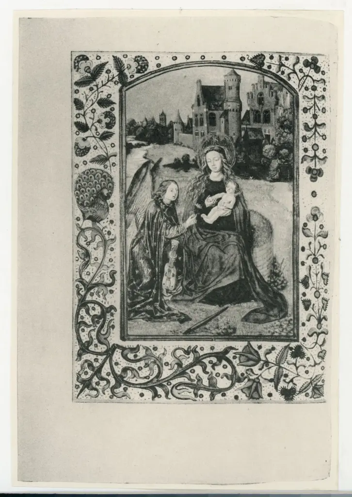 ![Anonimo sec. XV , Madonna con Bambino, Angelo musicante con viola, Cornice con motivi decorativi fitomorfi e animali, Pavone]()