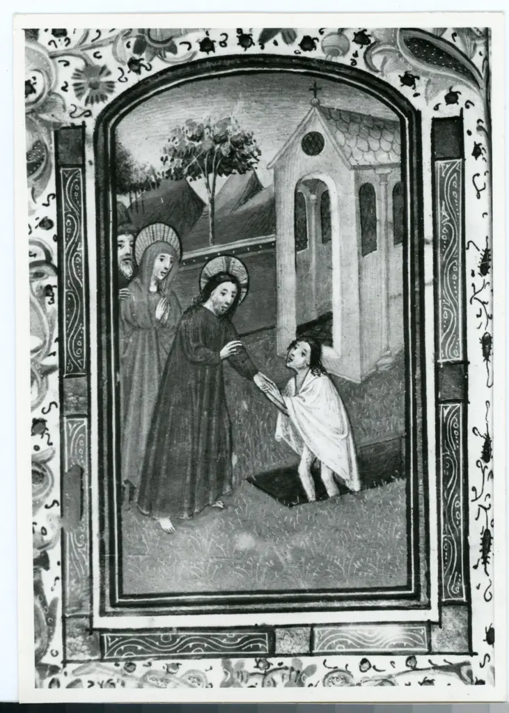 ![Anonimo sec. XV , Cornice con motivi decorativi fitomorfi e animali, Scena, Gesù Cristo, Colomba dello Spirito Santo]()