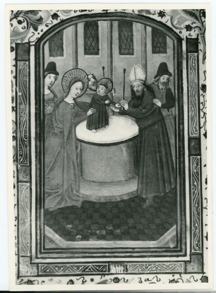 Anonimo sec. XV , Cornice con motivi decorativi fitomorfi e animali, Scena, Gesù Cristo, Colomba dello Spirito Santo Anonimo sec. XV
