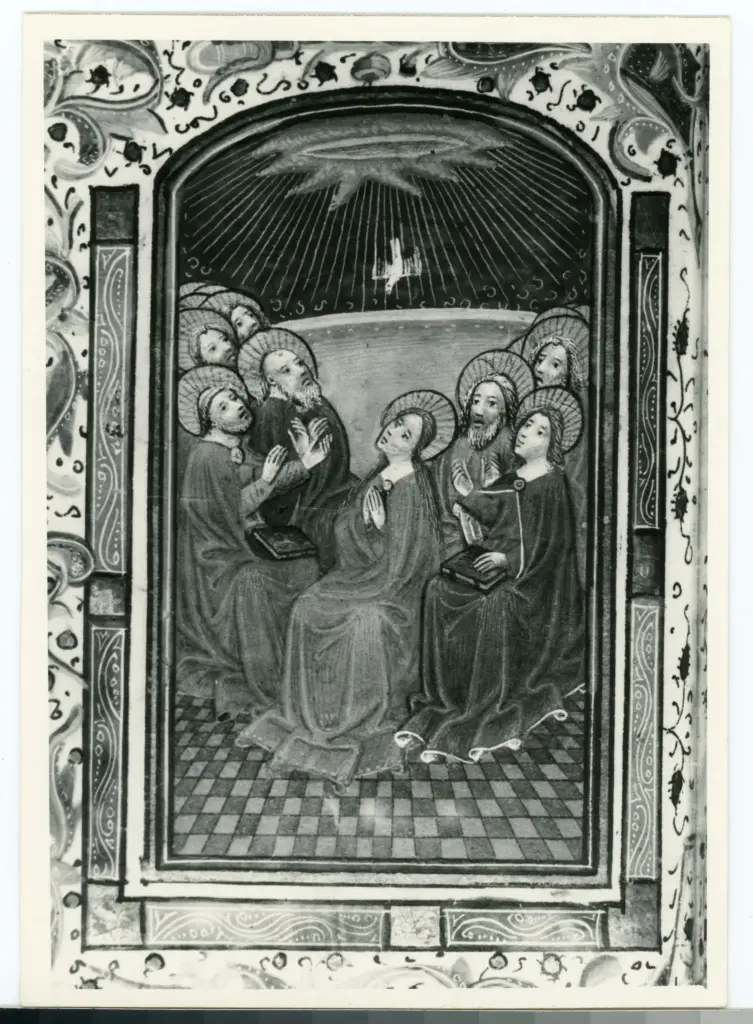 Anonimo sec. XV , Pentecoste, Cornice con motivi decorativi fitomorfi e geometrici Anonimo sec. XV
