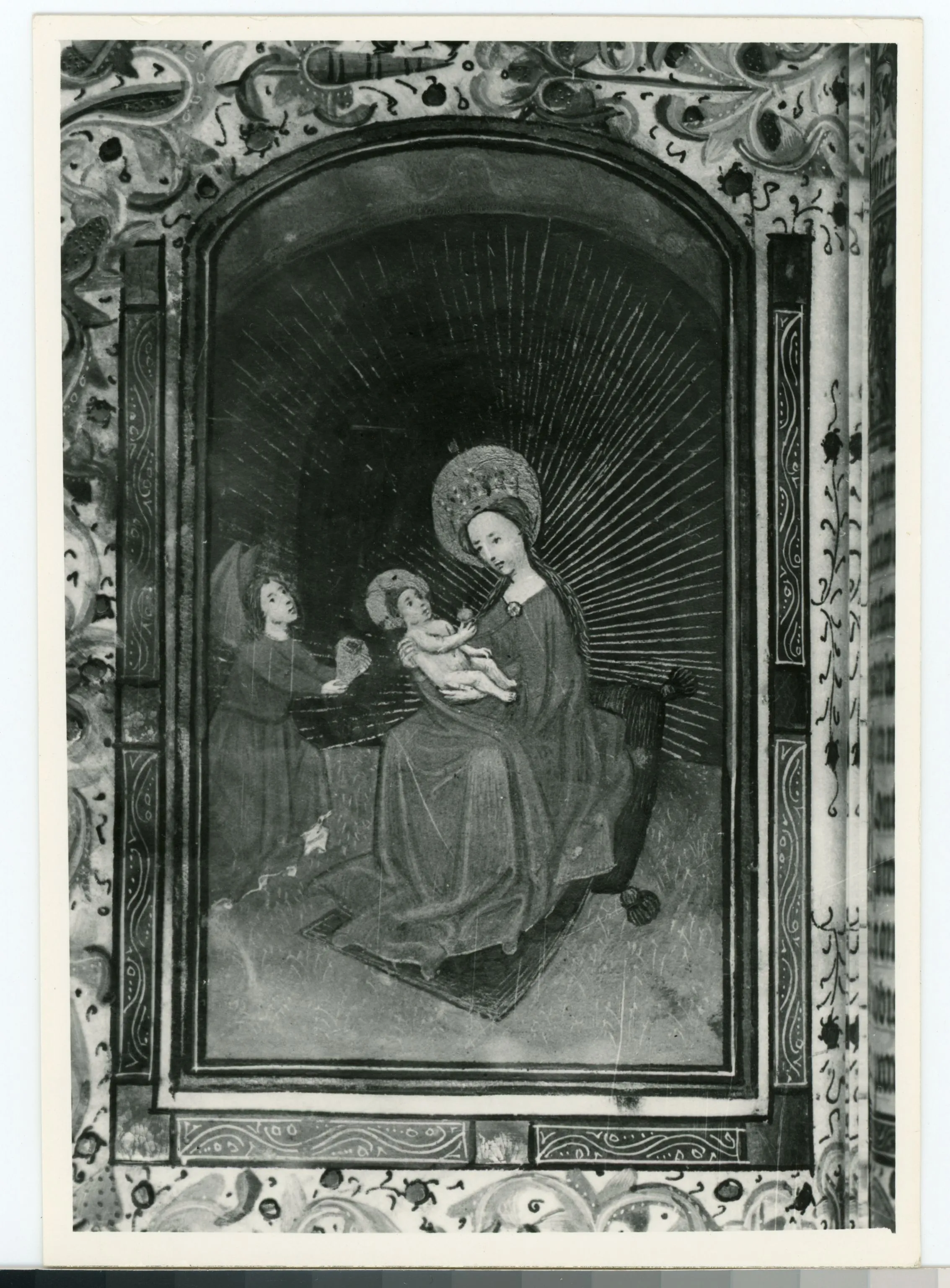 ![Anonimo sec. XV , Madonna con Bambino e angelo musicante, Cornice con motivi decorativi fitomorfi e animali]()