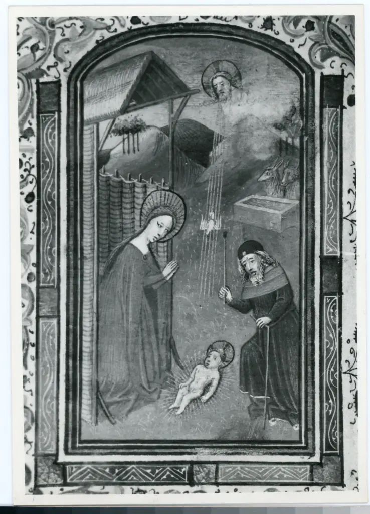 Anonimo sec. XV , Crocifissione di Cristo, Natività di Gesù, Iniziale D, Iniziale decorata, Cornice con motivi decorativi fitomorfi e animali Anonimo sec. XV