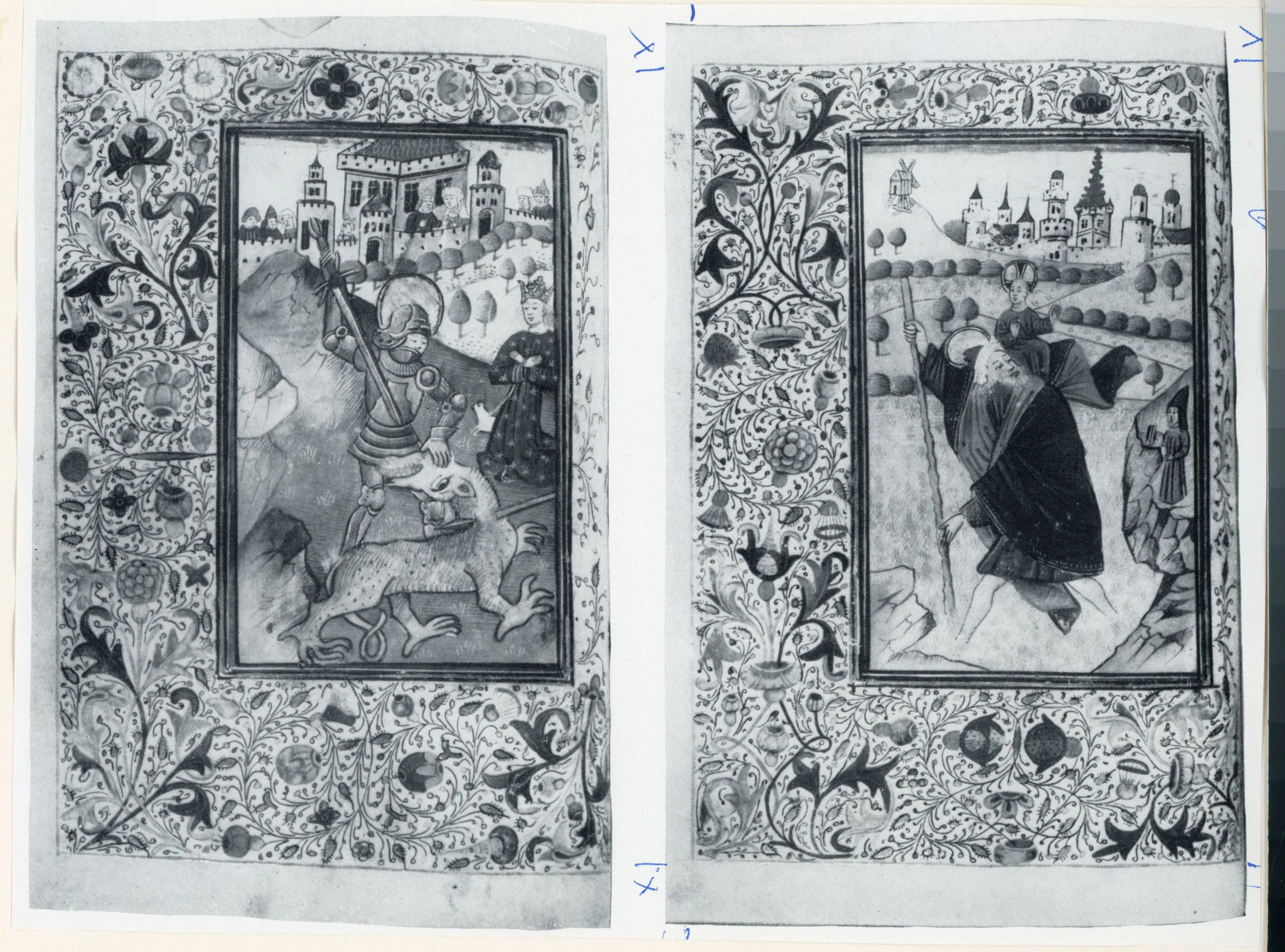 ![Anonimo sec. XV , Pagina miniata, San Giorgio uccide il drago, San Cristoforo, Cornice con motivi decorativi fitomorfi]()