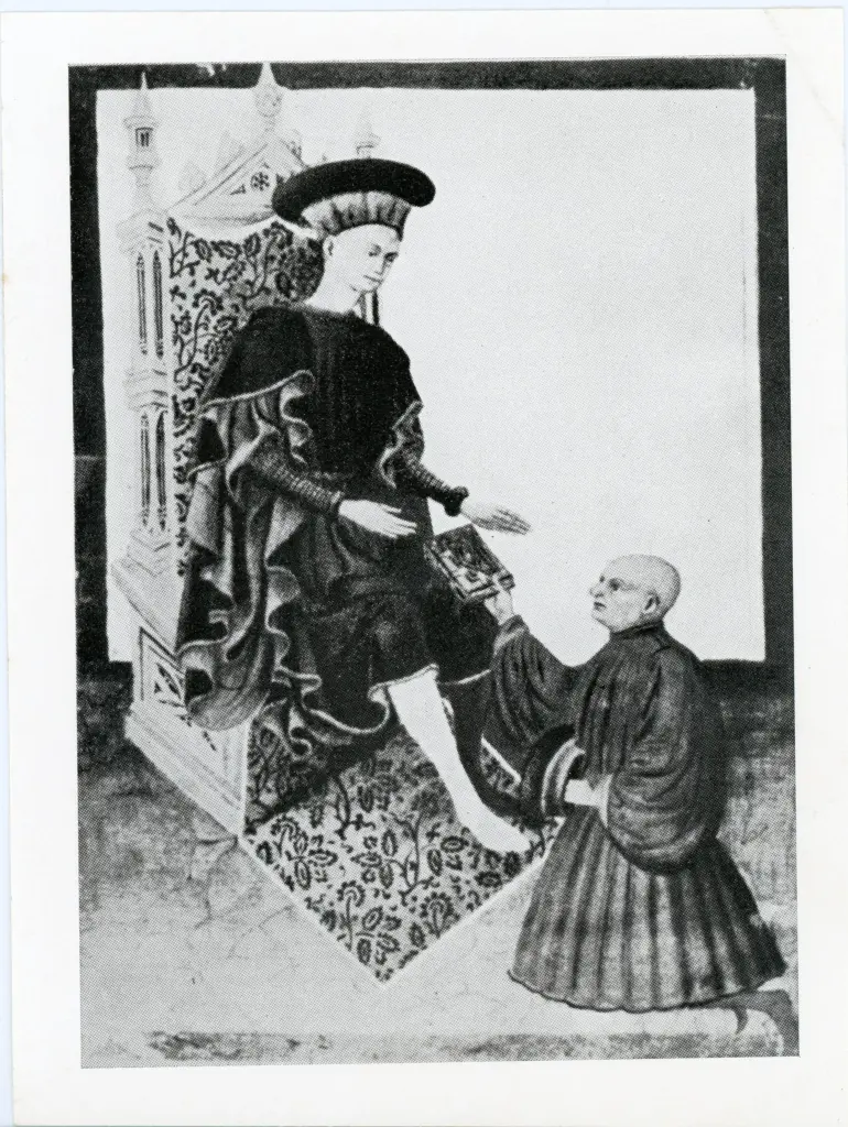 ![Anonimo sec. XV , Ritratto di papa Clemente V allo scrittoio, Motivi decorativi fitomorfi, Iniziale I, Iniziale decorata]()
