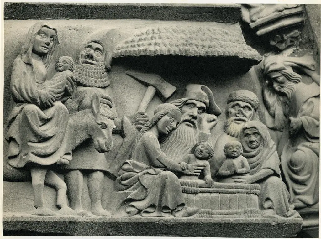 Anonimo tedesco sec. XIV, (?) , Presepe con Gesù Bambino, bue, asino e due pastori Anonimo tedesco sec. XIV, (?)
