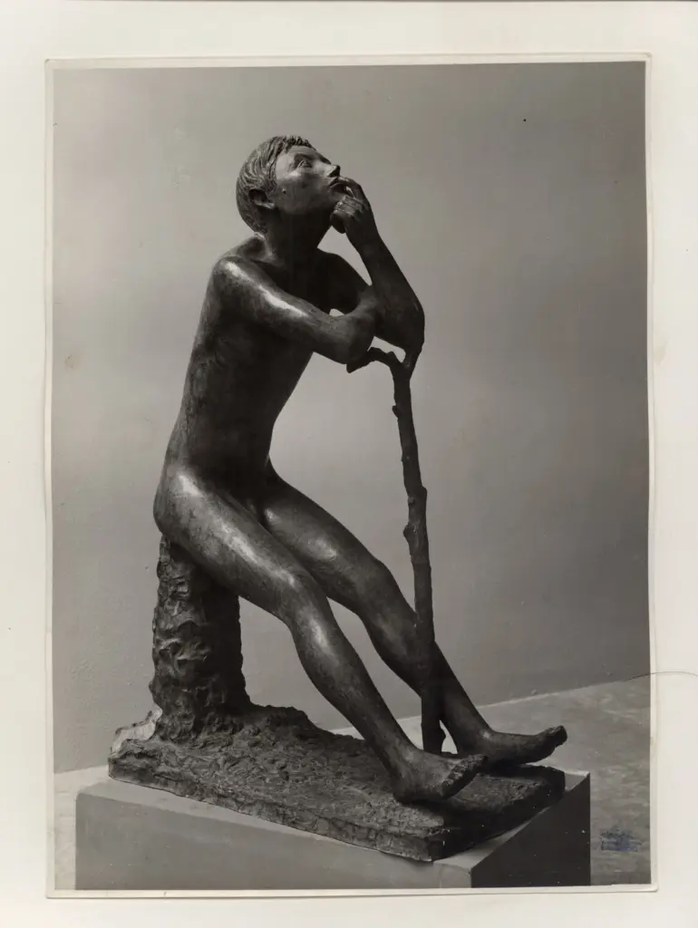 ![Cappello, Carmelo , Statuetta di ragazzo seduto con bastone in atteggiamento di riflessione]()