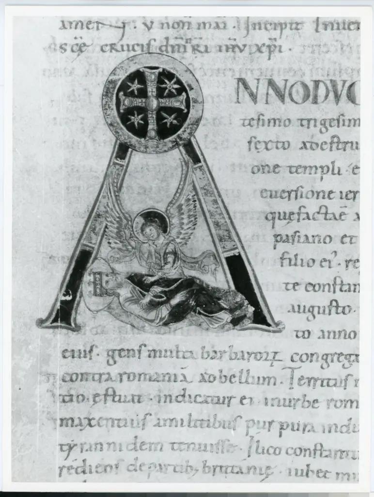 Anonimo italiano sec. XI , Iniziale A, Iniziale istoriata, Sogno di Costantino, Costantino, Angelo, Croce gemmata, Motivo decorativo a stelle Anonimo italiano sec. XI