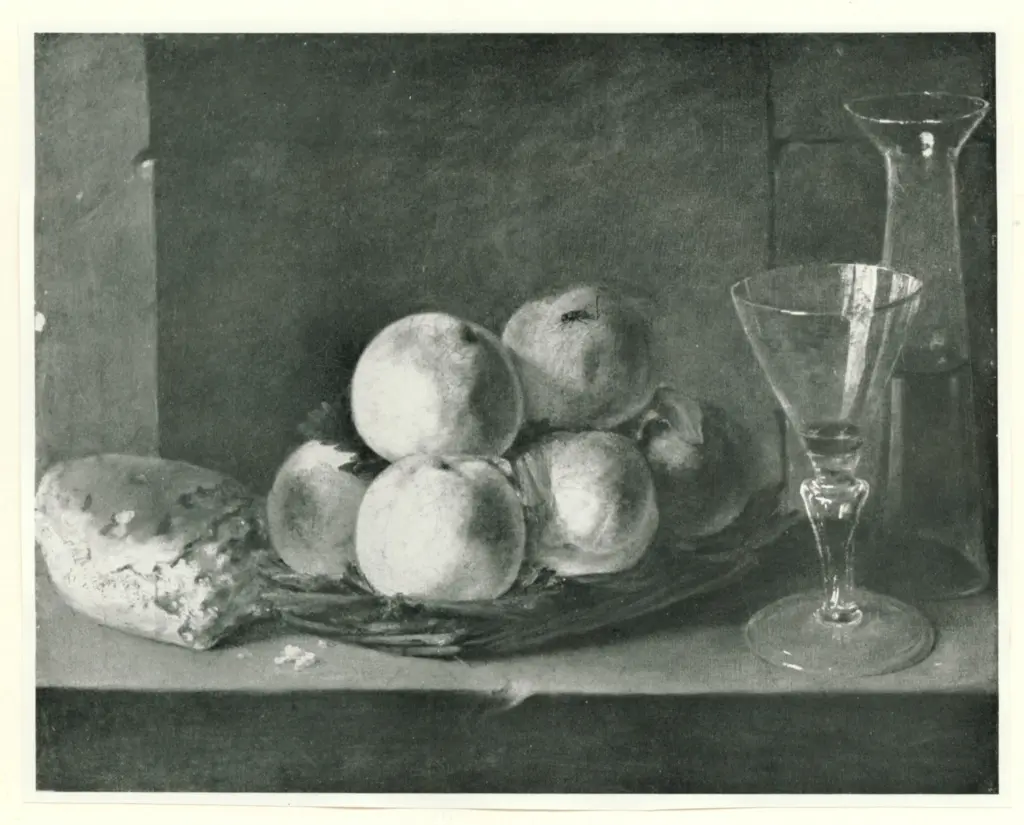 A Still Life oh Peaches a loaf of bread,and a glass and carafe of wine