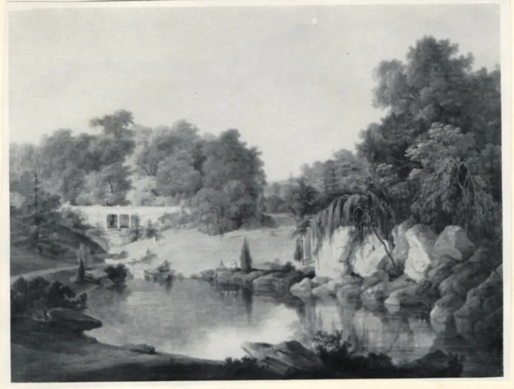 Daniell, Thomas , A view of the Temple, Fountain and Cave in Sezincote Park Daniell, Thomas