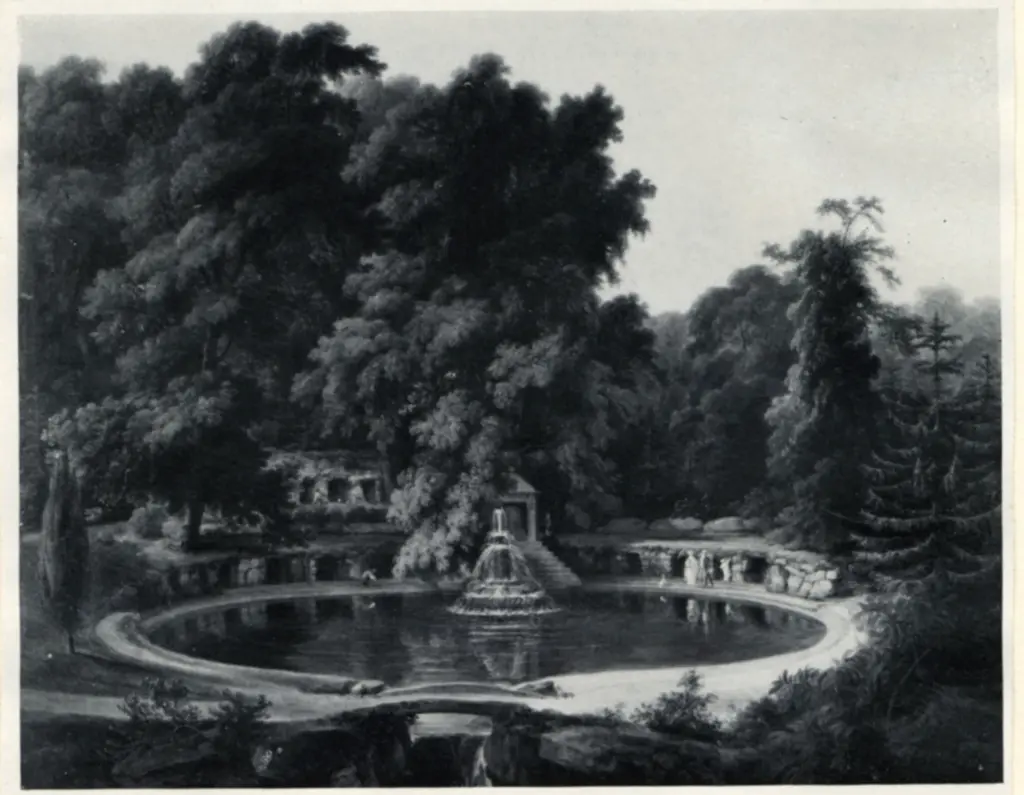 A view of the Temple, Fountain and Cave in Sezincote Park