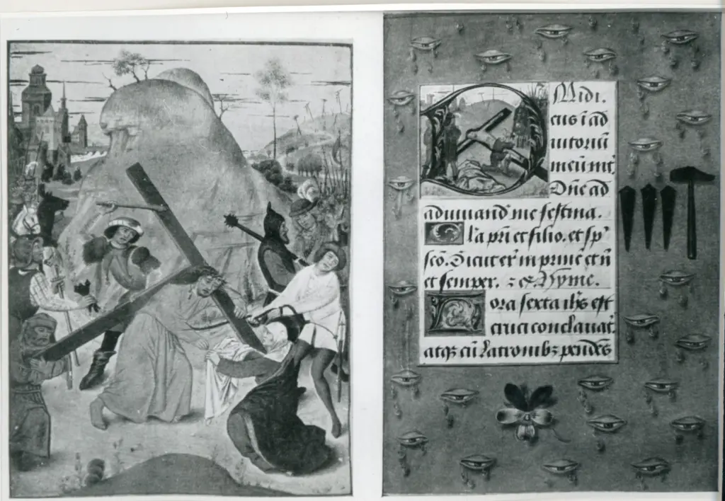 Salita di Cristo al monte Calvario, Iniziale D, Iniziale istoriata, Crocifissione di Cristo, Occhi che piangono, Chiodi e martello