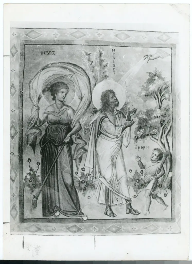 Anonimo bizantino sec. X , Isaia, Allegoria della Notte, Allegoria dell'Aurora, Dextera Domini, Cornice con motivi decorativi fitomorfi e geometrici Anonimo bizantino sec. X