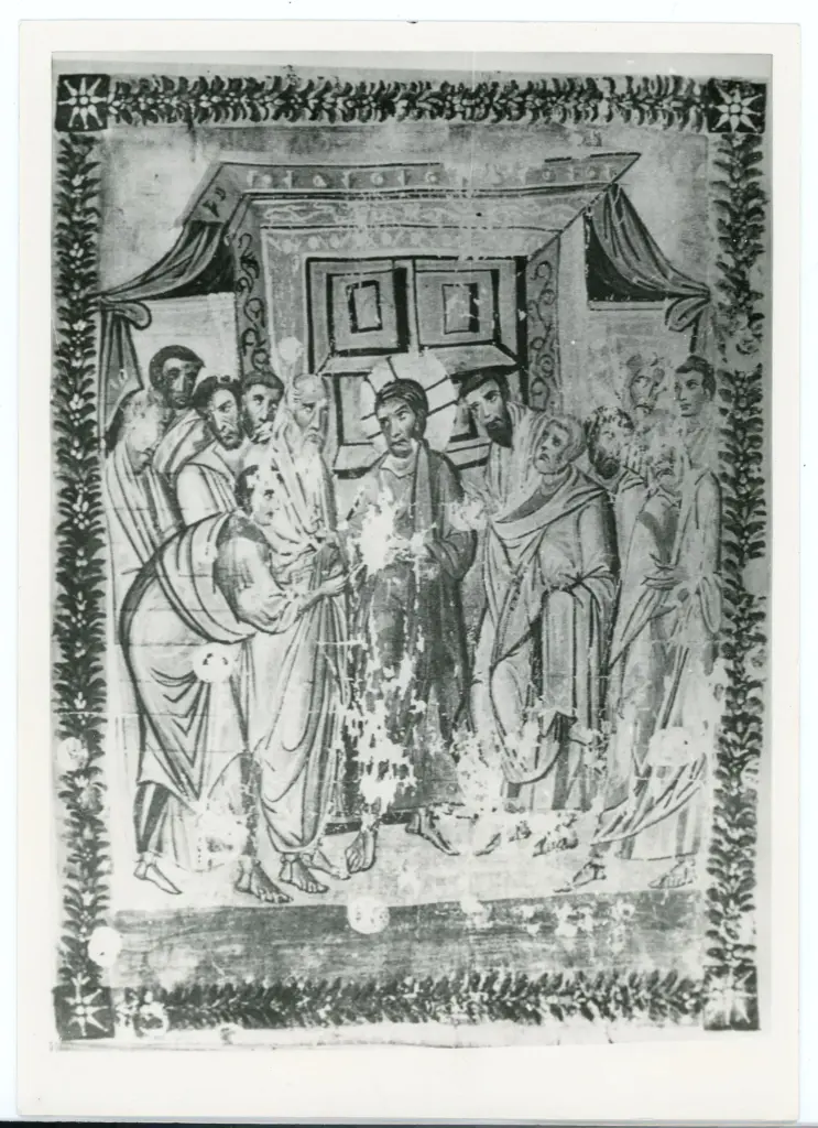 Anonimo bizantino , Incredulità di san Tommaso, Finte architetture, Cornice con motivi decorativi fitomorfi Anonimo bizantino