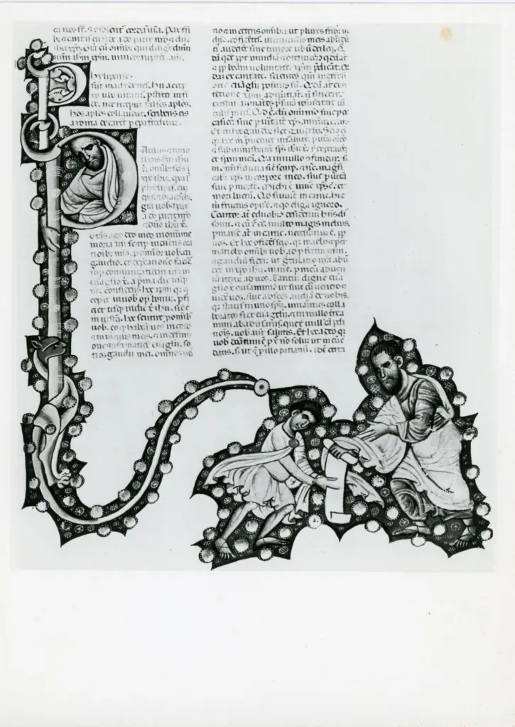 Anonimo sec. XVIII , Figure maschili, Figure maschili in costume ![ , Iniziale P, Iniziale abitata, San Paolo, Motivo decorativo zoomorfo]()