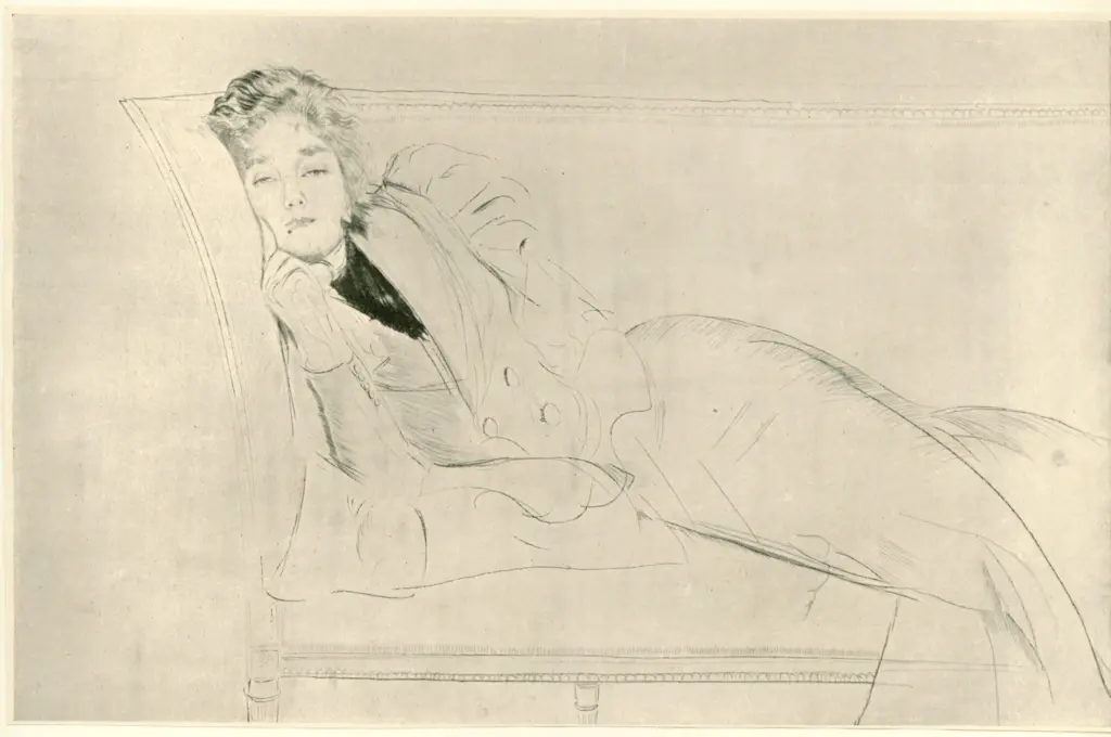 ![Helleu, Paul , Mme Helleu regardant les dessins de Watteau]()