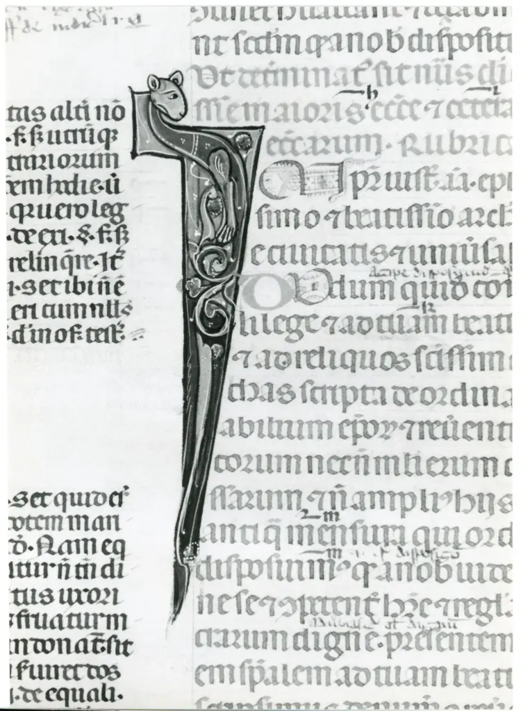 Anonimo italiano sec. XIV , Iniziale I, Iniziale figurata, Motivo decorativo zoomorfo, Monaco Anonimo italiano sec. XIV