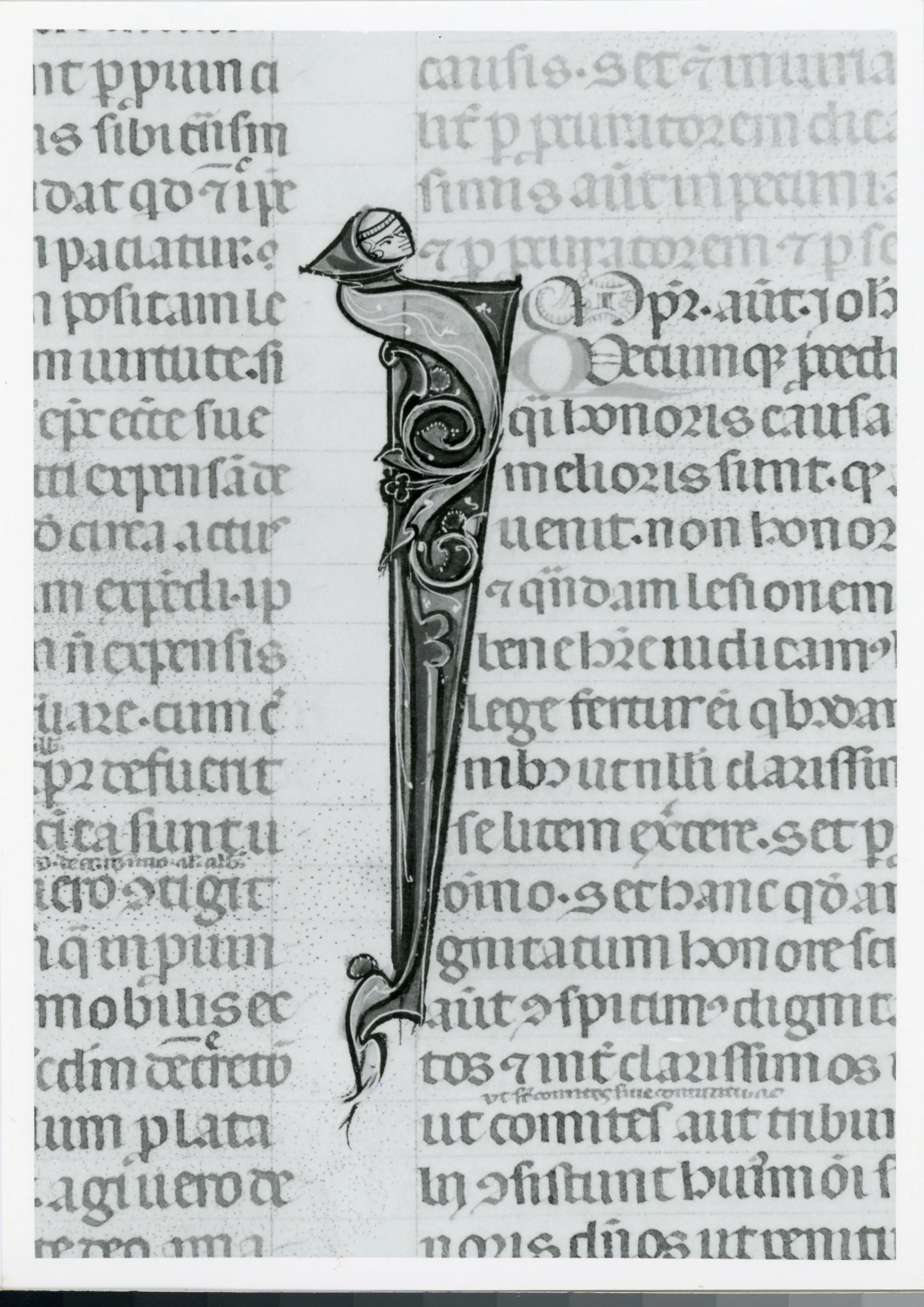 Iniziale I, Iniziale figurata, Testa di vescovo, Motivi decorativi con figure fantastiche