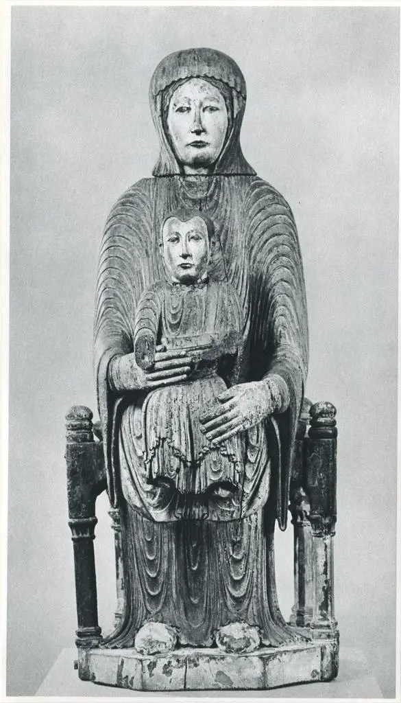 173. Virgin and Child. French (School of Auvergne), 1150-1200. Oak, painted in colors. H. 31 in.