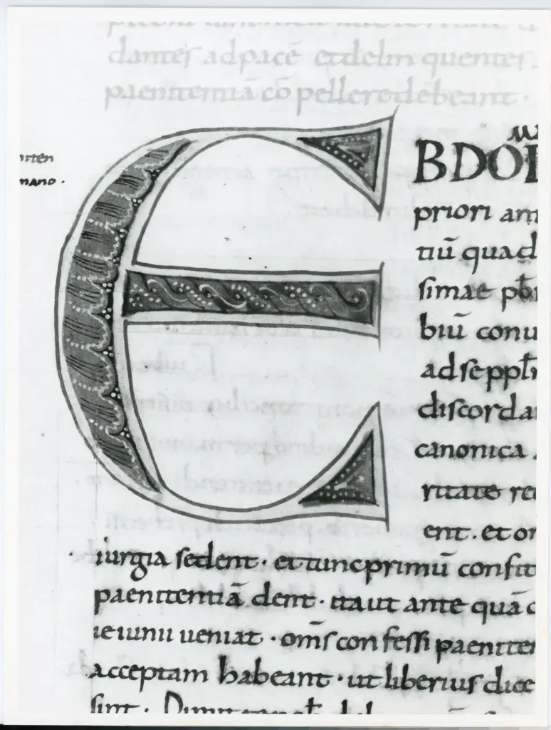 Anonimo italiano sec. XI , Iniziale E, Iniziale decorata, Motivi decorativi geometrici e vegetali, Intreccio Anonimo italiano sec. XI