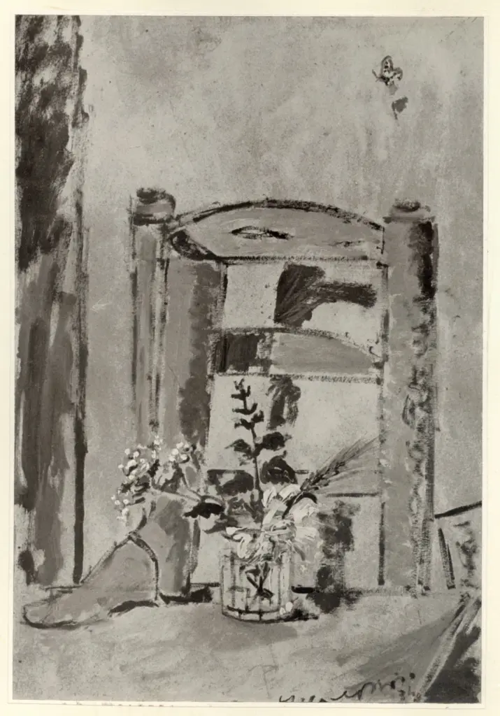![De Pisis, Filippo , Vase avec fleurs et dossier de chaise]()
