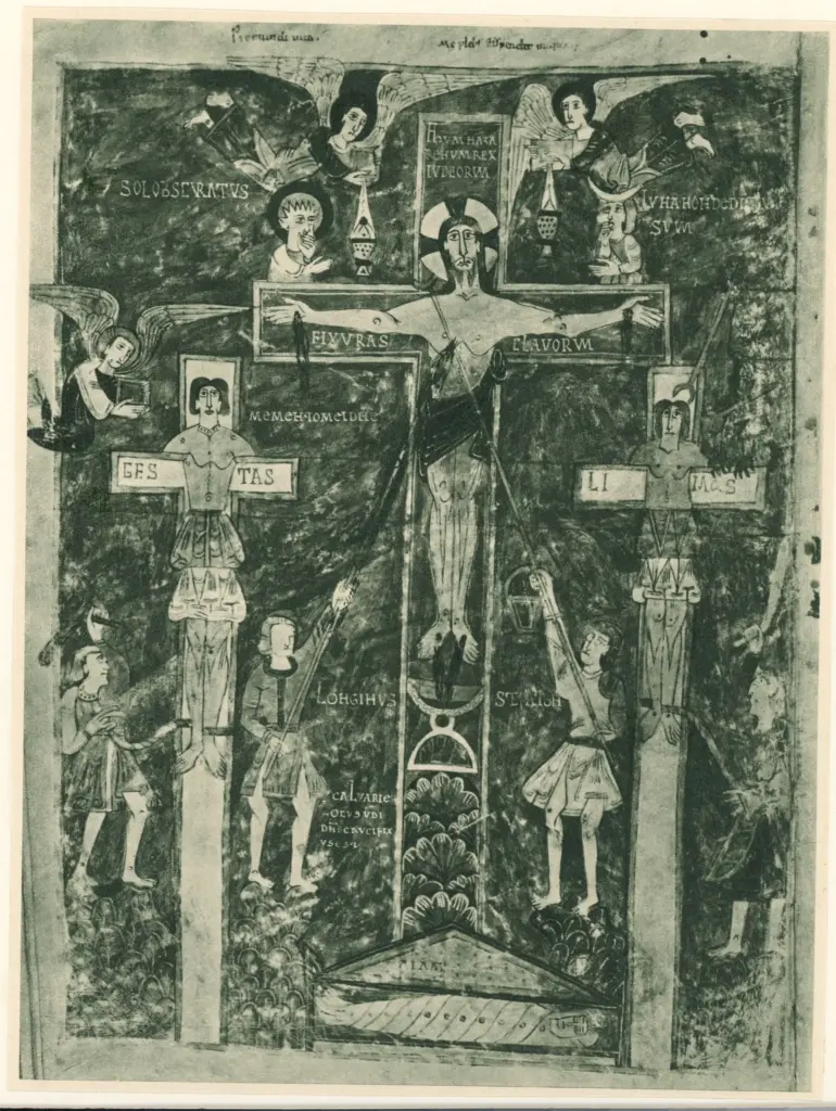 ![Anonimo spagnolo sec. X , Crocifissione di Cristo con i dolenti, Longino trafigge il fianco di Cristo con la lancia]()