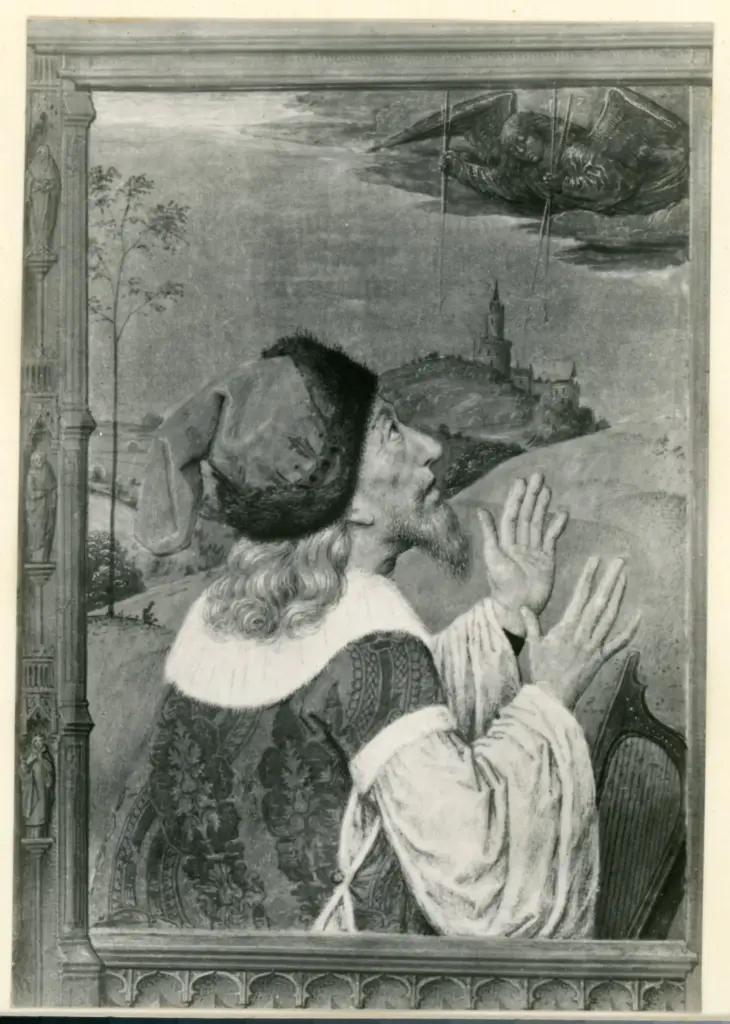 Marmion Simon , Ritratto di gentiluomo con cappello in un paesaggio, Cornice architettonica Marmion Simon