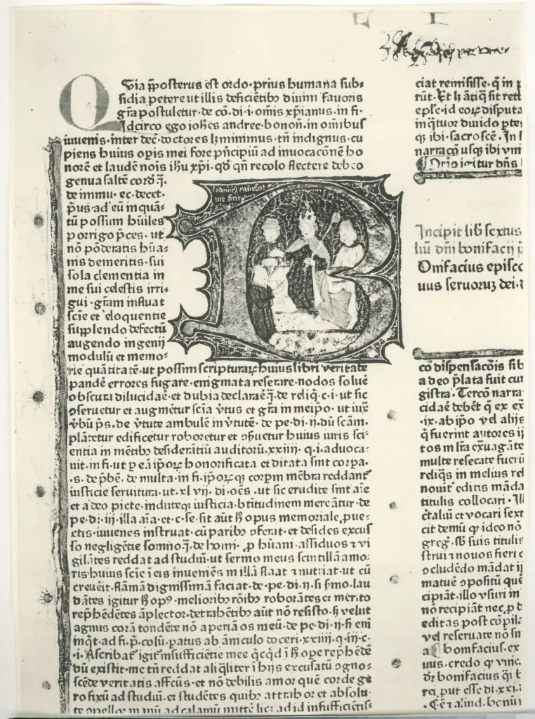 Ravescot Ludovicus , Iniziale B, Iniziale istoriata, Scena di dedica di un libro Ravescot Ludovicus