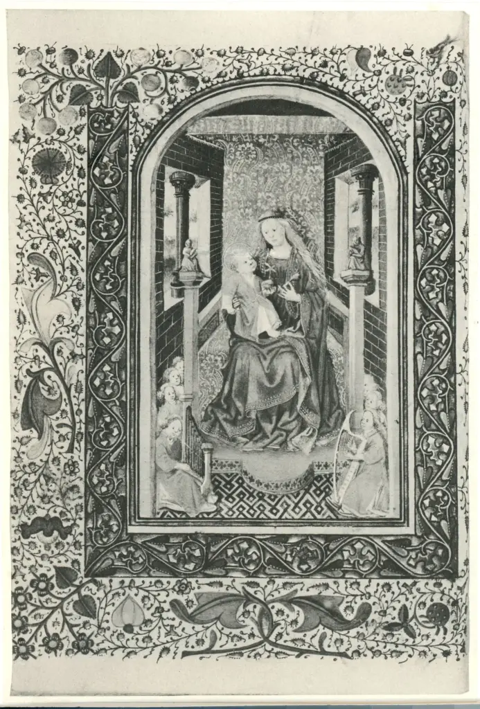 Jacquemart de Hesdin , Madonna con Bambino in trono, Stemmi araldici, Cigno, Fregio con motivi vegetali Jacquemart de Hesdin