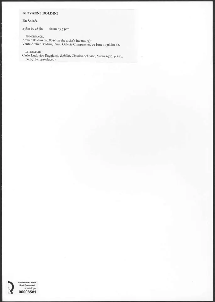 GIOVANNI BOLDINI En Soirée 60 cm by 73 cm PROVENANCE: Atelier Boldini (no.80 bis the artist's inventory). Vente Atelier Boldini, Paris, Galerie Charpentier, 29 June 1936, lot 62. LITERATURE: Carlo Ludovico Ragghianti, Boldini, Classica del Arte, Milan 1970, p.113, no.29Ib (reproduced).
