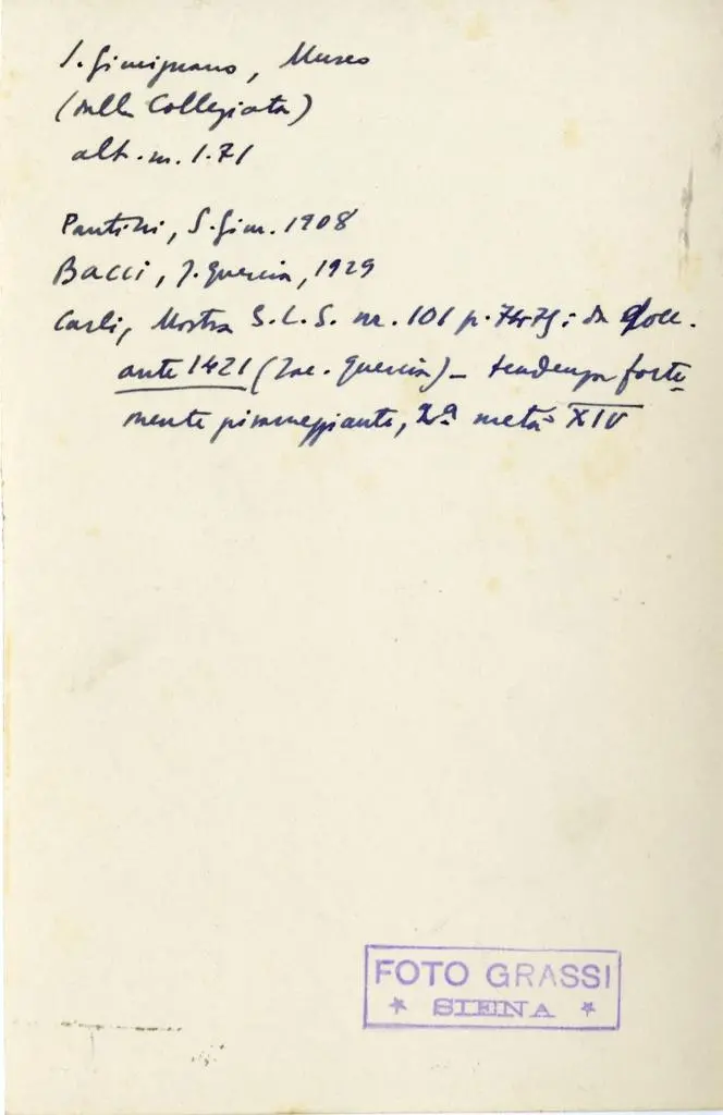 alt. m. 1.71/ Pantini, S. Gim. 1908/ Bacci, J. Quercia, 1929/ Carli, Mostra S. L. S. nr. 101 p. 74-75: da docc./ ante 1421 (Jac. Quercia). Tendenza forte-/ mente pisaneggiante, 2° metà XIV