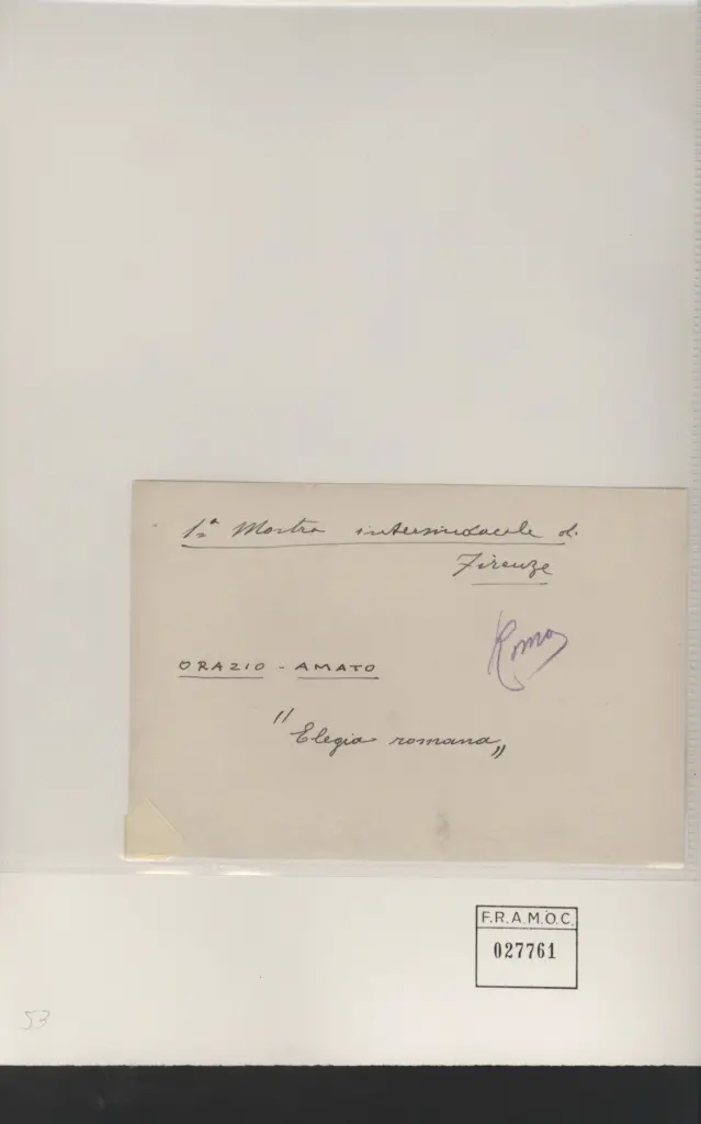 1° Mostra intersindacale di Firenze Roma Orazio Amato "Elegia Romana" F.R.A.M.O.C. 027761 presente sul supporto non più incollato al retro della foto.