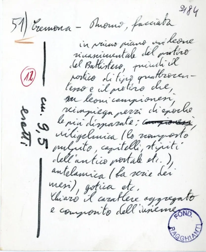 51) Cremona - Duomo, facciata/ in primo piano un leone rinascimentale del protiro del Battistero, quindi il portico di tipo quattrocentesco e il protiro che, con leoni campionesi, reimpiega pezzi di epoche le più disparate: wiligelmica (lo scomposto pulpito, capitelli, stipiti dell'antico portale etc.), antelamica (la serie dei mesi), gotica etc. Chiaro il carattere aggregato e composito dell'insieme.