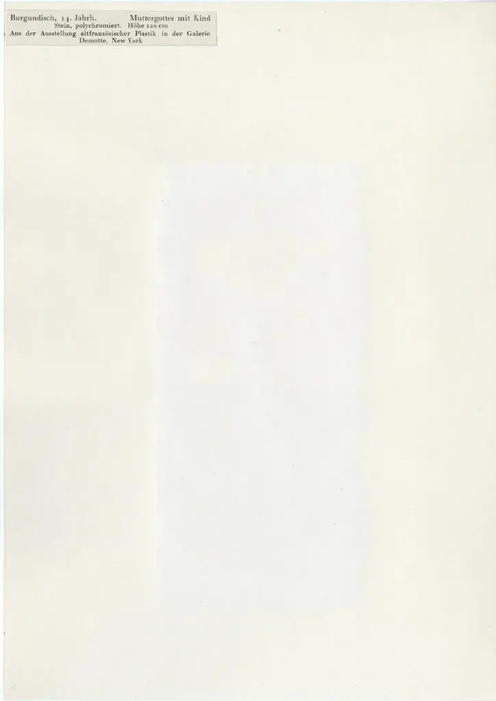 Burgundisch, 14. Jahrh. Muttergottes mit Kind. Stein, polychromiert. Hohe 120 cm. Aus der Ausstellung altfranzösischer Plastik in der Galerie Demotte, New York