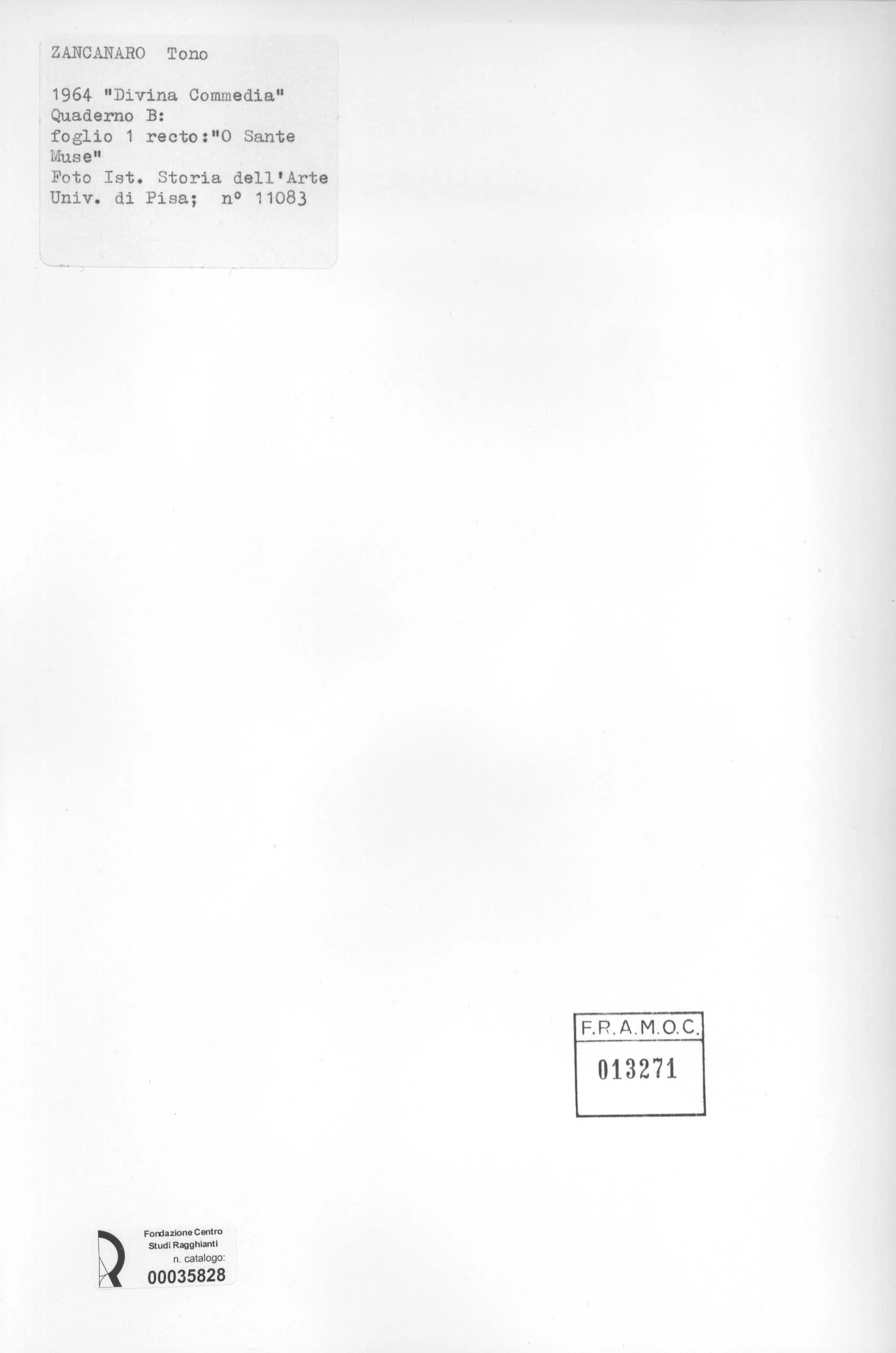 Università di Pisa. Dipartimento di Storia delle Arti , Zancanaro, Antonio - sec. XX - "Divina Commedia": quaderno B, foglio 1 recto: "O Sante Muse"