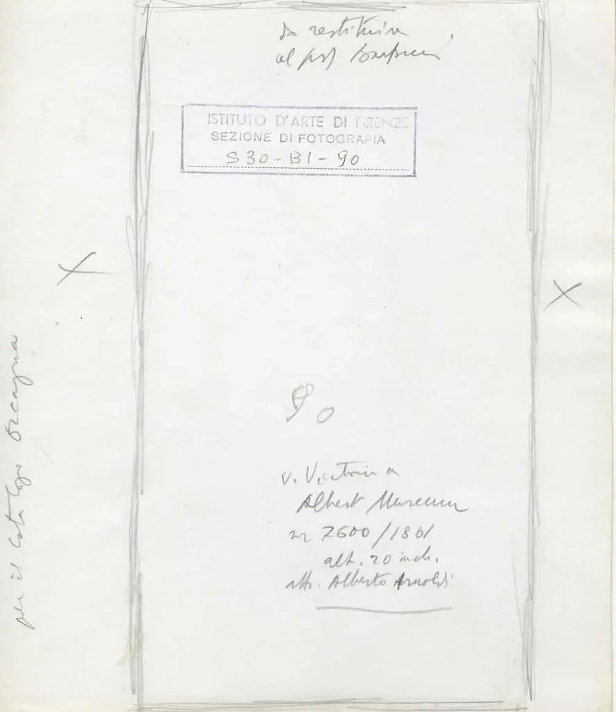 per il catalogo Orcagna/ da restituire al prof. Barpini [?]/ 90 v. Victoria a Albert Museum n. 7600/1861/ alt. 20 inch./ attr. Alberto Arnoldi