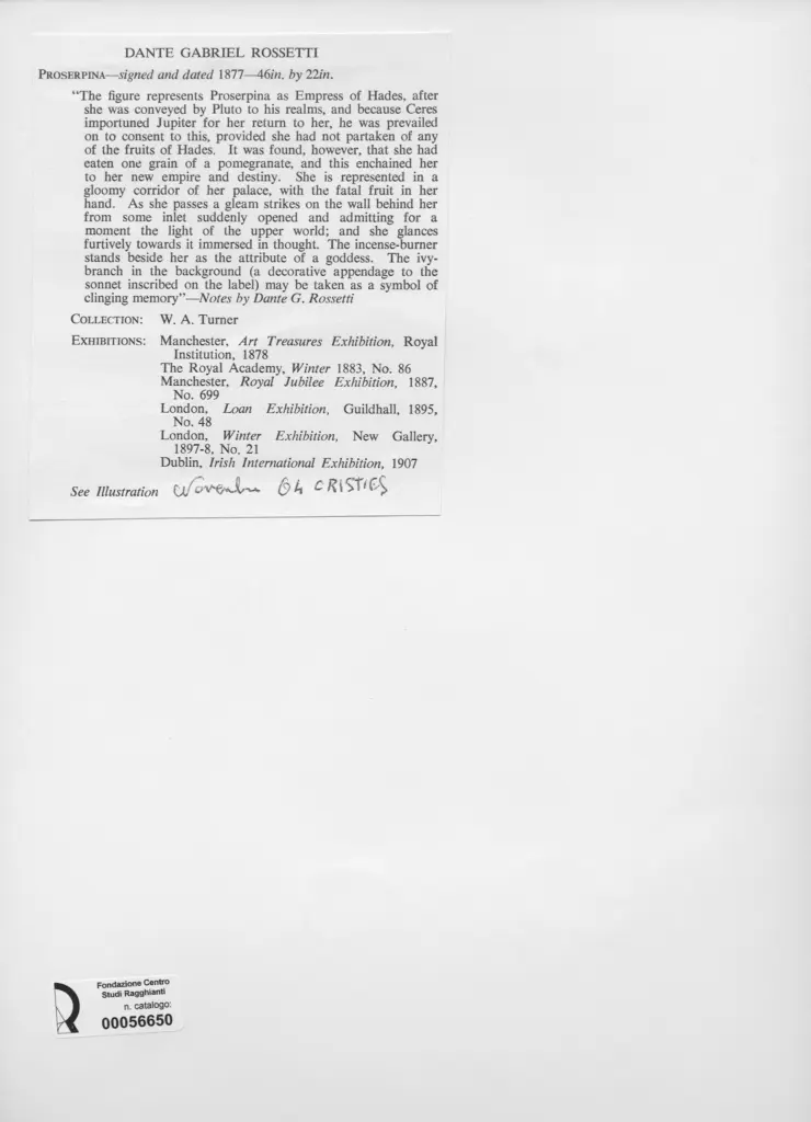 Anonimo , Rossetti, Dante Gabriele - sec. XIX - Proserpina , fronte
