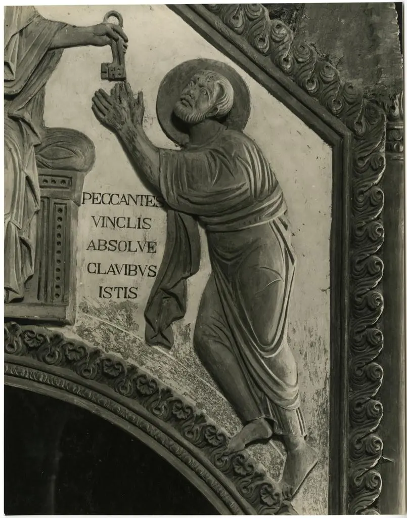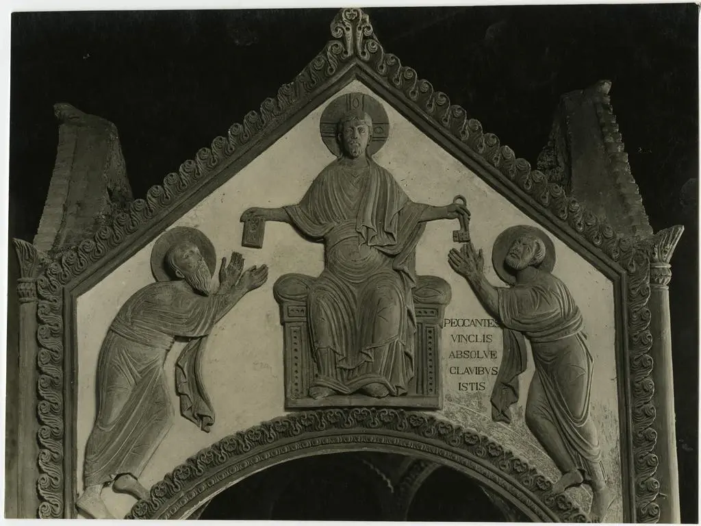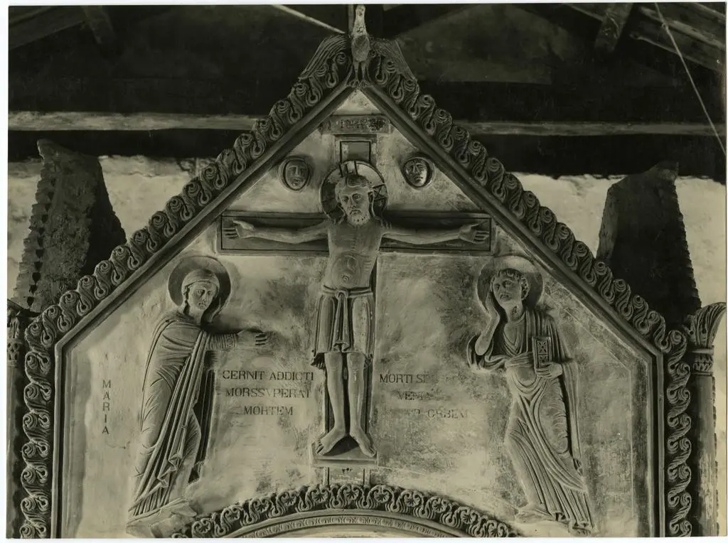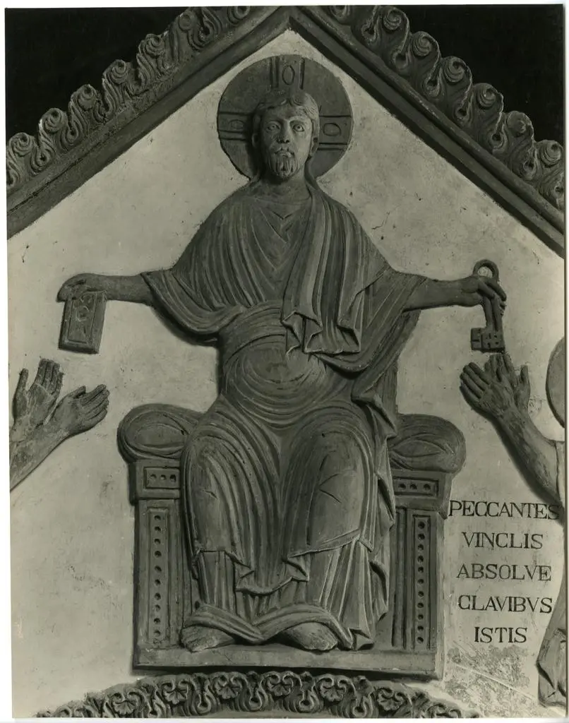 Anonimo lombardo sec. XI, Cristo Redentore benedicente in mandorla e angeli, Ascensione di Cristo, Angelo della Resurrezione, Cristo crocifisso con la Madonna addolorata, san Giovanni Evangelista, Simbolo di san Matteo Evangelista: angelo, Maria Maddalena, Marie al sepolcro, Cristo tra san Paolo e san Pietro, Simbolo di san Giovanni Evangelista: aquila