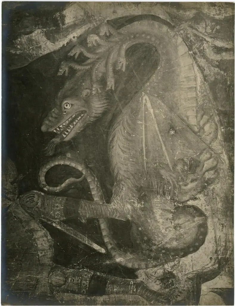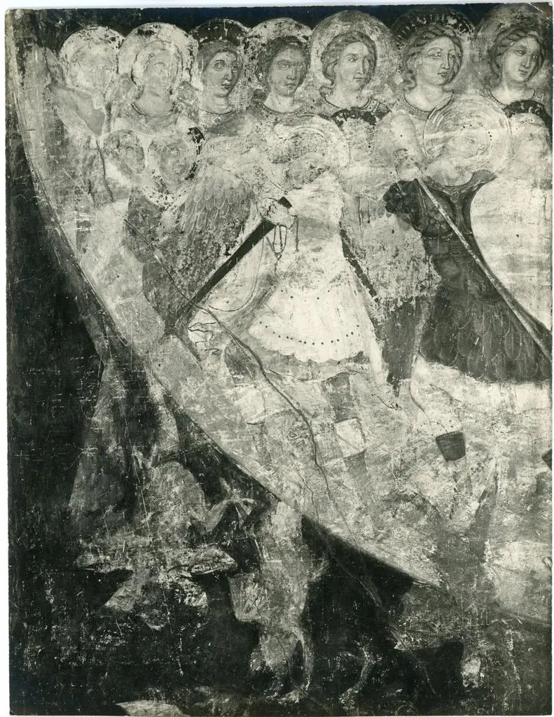 Maestro della Cappella Velluti, Storie della vita di san Michele Arcangelo, Apparizione del toro sul Monte Gargano, San Michele Arcangelo combatte contro il drago