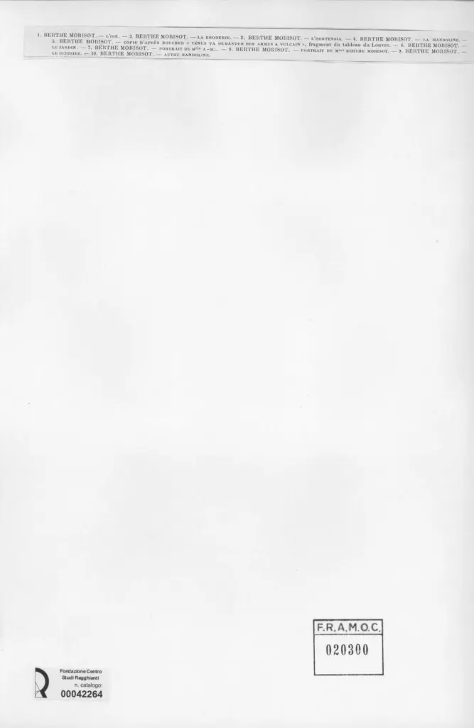 L'oie/La broderie/L'hortensia/La mandoline/Venus va demander des armes a vulcain/Le jardin/Portrait de M.lle J./Portrait de M.me B. Morisot/Le cerisier/autre mandoline