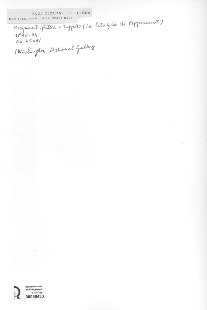 Cezanne, Paul, Recipienti, frutta e tappeto (la bottiglia di Peppermint)