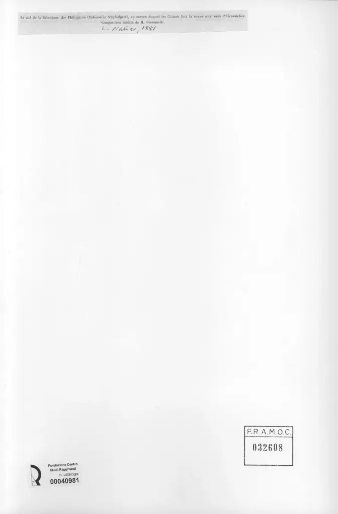Giacomelli, M., Le nid de la Salangane des Philippines (Collocalia troglodytes), au moyen duquel les Chinois font la soupe aux nids d'hirondelles -