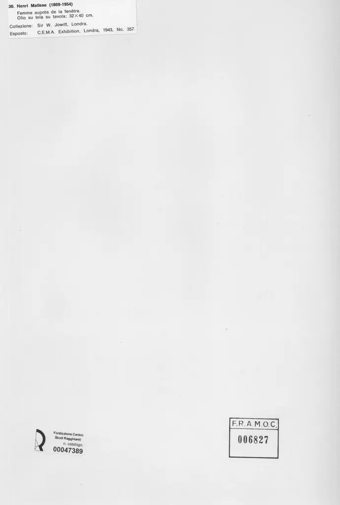 • Anonimo , Matisse, Henri - sec. XIX/ XX - Femme après de la fenêtre , fronte