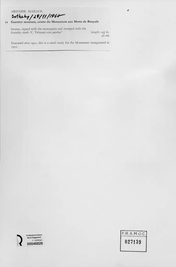 Maillol, Aristide, Guerriero morente, parte centrale del monumento funebre di Banyuls