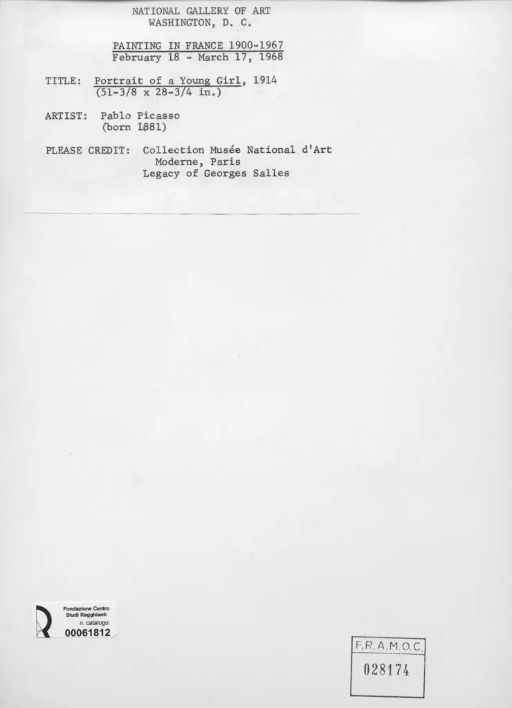 • Anonimo , Picasso, Pablo - sec. XX - Portrait of a young girl , fronte