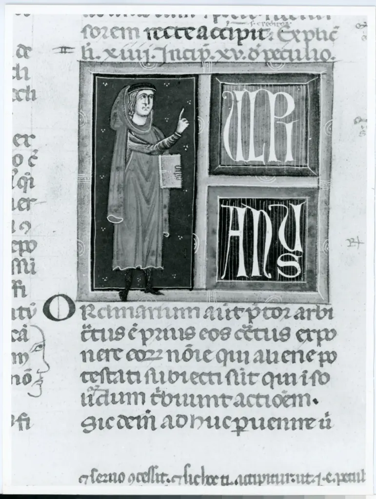 Anonimo italiano sec. XIV, Miniatura tabellare, Figura maschile con libro, Figura stante