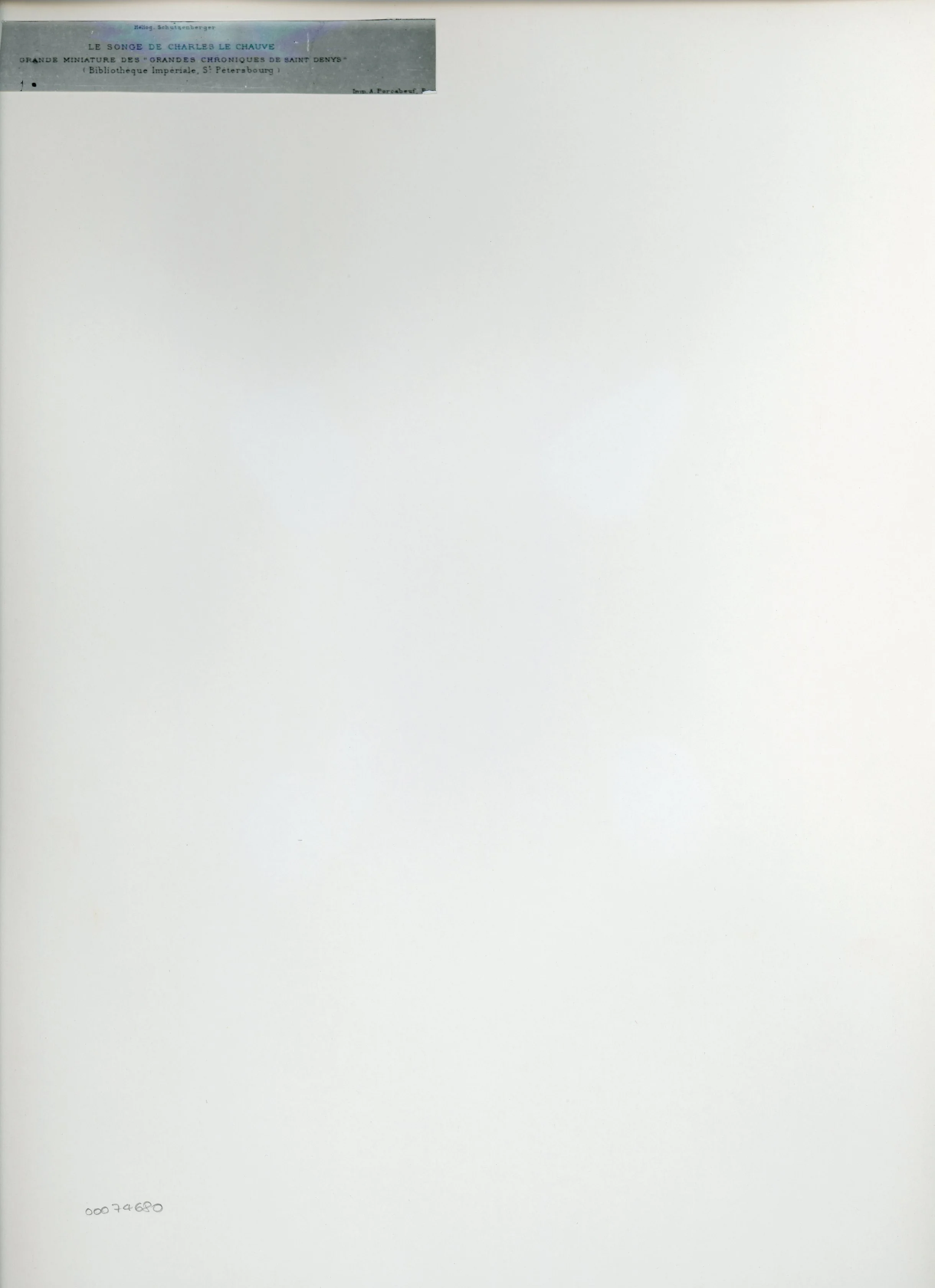 Si tratta della fotografia della riproduzione fotomeccanica del foglio 207v del manoscritto Erm. Fr. 088 della Biblioteca nazionale di Russia di San Pietroburgo (Grandes Chroniques de France note come Grandes Chroniques de saint Denis) pubblicata in Reinach Salomon, Un manuscrit de Philippe le Bon à la Bibliothèque de Saint-Pétersbourg (deuxième partie), in «Gazette des Beaux-Arts», 3 pér., t. 30, pp. 371-380: pag. non num. tra le pp. 376 e 377. La miniatura, che si trova all'inizio della Chronique de Charles le Chauve (cap. 12), è riprodotta all'indirizzo https://initiale.irht.cnrs.fr/it/decor/14387 (data ultima consultazione: 28/11/2023).
